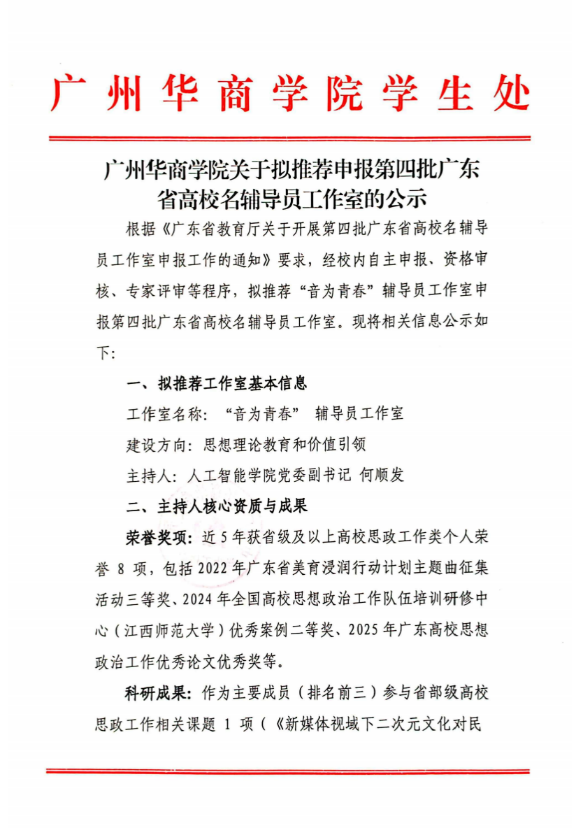 现下发“广州华商学院关于拟推荐申报第四批广东省高校名辅导员工作室的公示”文件,公示时间为2025年10月23日 —2025 年 10月29日(共 5 个工作日),公示期间,如对拟推荐工作室有异议,请以书面形式(需实名并附联系方式、相关佐证材料)向学校学生处反映。 联系电话:020-82669666(马老师)...