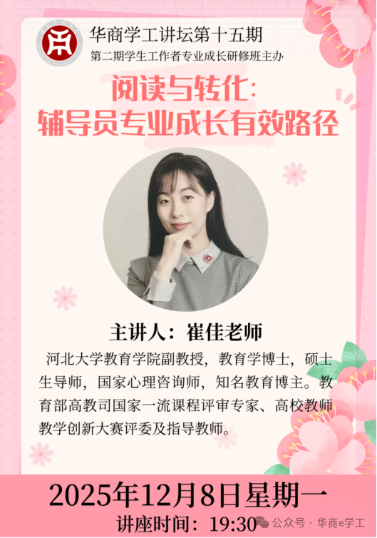在信息爆炸的时代,阅读如何真正助力辅导员的专业成长?2025年12月8日晚,华商学工讲坛第十五期暨学生工作者专业成长研修班讲座在线成功举办。河北大学教育学院副教授、教育学博士崔佳老师应邀作题为“阅读与转化:辅导员专业成长有效路径”的专题讲座,来自广州华商学院各学院的辅导员积极参与学习。一、成长路径:从阅读到成果的高效转化崔佳老师以自身经历开篇,分享如何在三年内出版八本专著,并计划在今年完成六本新书的成......