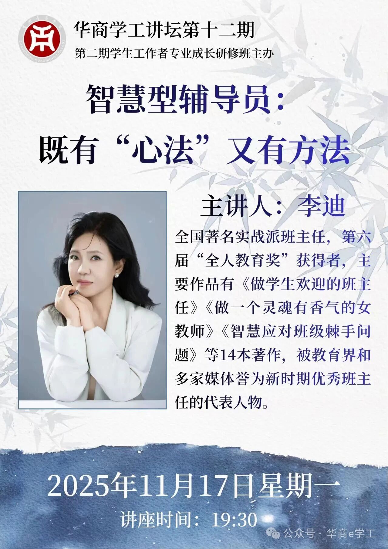 为精准回应新时代学生工作挑战,助力学工队伍提升专业素养,华商学院第二期学生工作者专业成长研修班第十二期讲座于2025年11月17日晚19:30顺利举办开讲!全国著名实战派班主任李迪老师,以《智慧型辅导员:既有“心法”又有方法》为主题,结合前沿心理学研究与一线实践经验,从焦虑成因解析、核心心法修炼到实操技巧落地,带来了一场兼具深度与实用性的育人盛宴。本次讲座围绕核心议题层层展开,干货密集、直击痛点,为学工队伍......