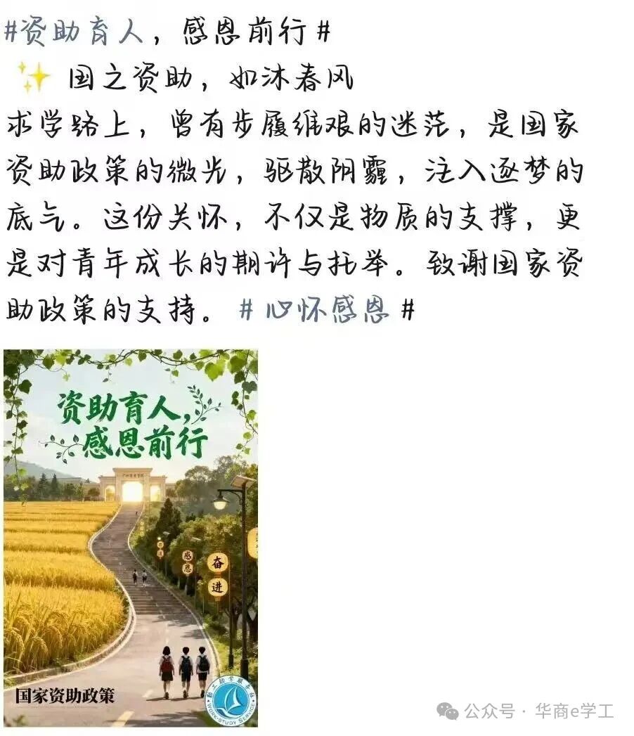 当朋友圈被 “感恩” 刷屏,当文字里藏着滚烫的心意 ——“资助育人,感恩前行” 感恩主题传播活动,圆满落下帷幕啦这段时间里,我们收到了无数份来自同学们的真诚分享:有对国家资助政策的感谢,有对学校帮扶的铭记,也有对家人默默支持的温柔告白。每一条朋友圈,都是一份双向奔赴的温暖~本次活动由校勤工助学服务社发起,以 “朋友圈感恩传播” 为形式,邀请同学们带上官方宣传图 + 原创感恩文字,传递 “感恩诚信、奋发向......