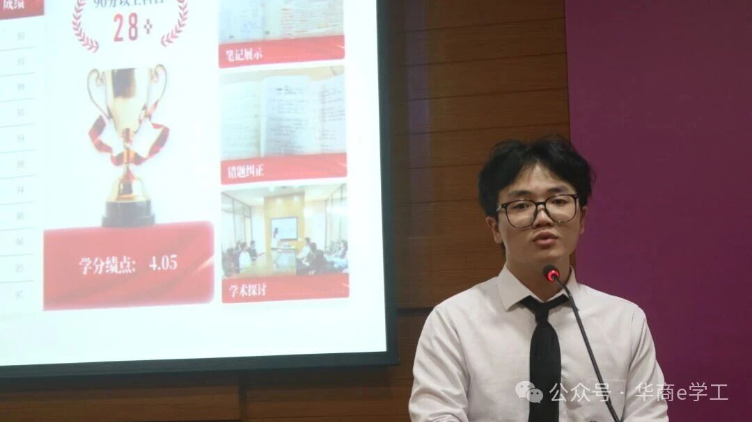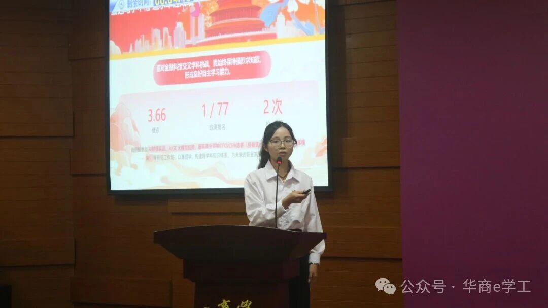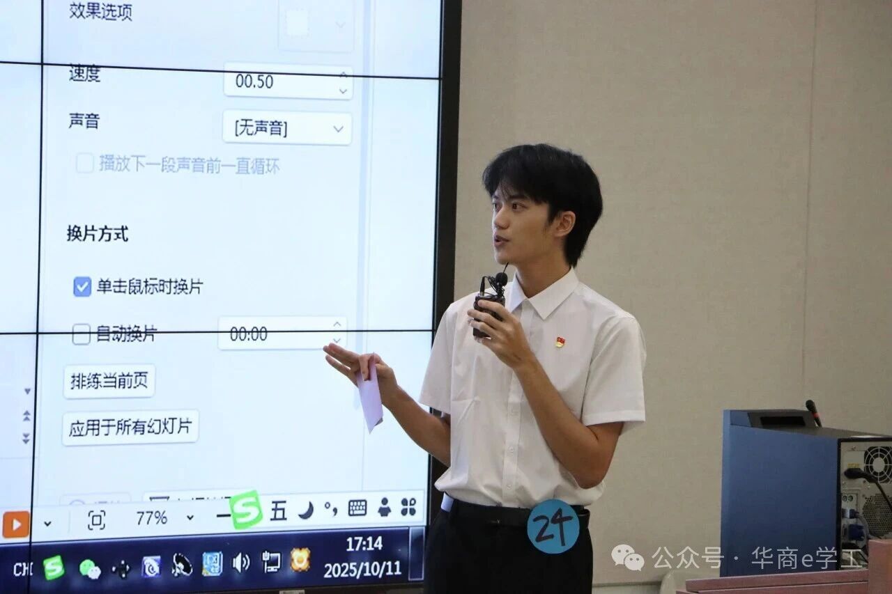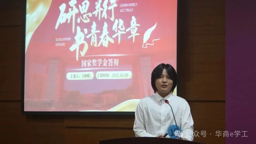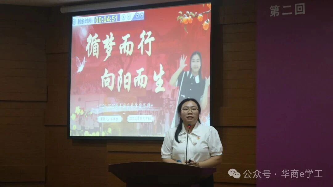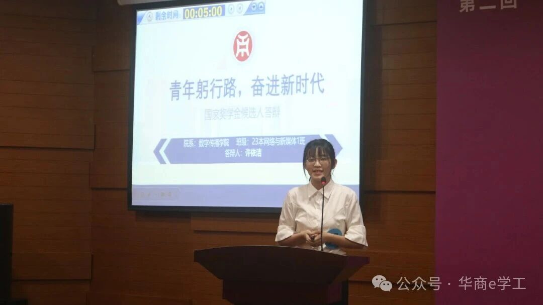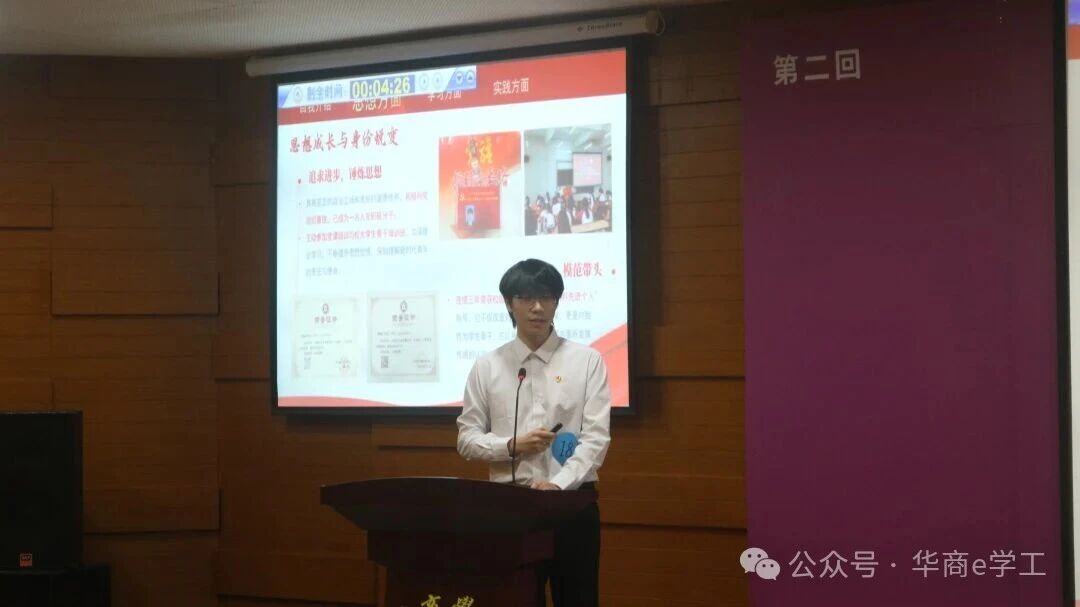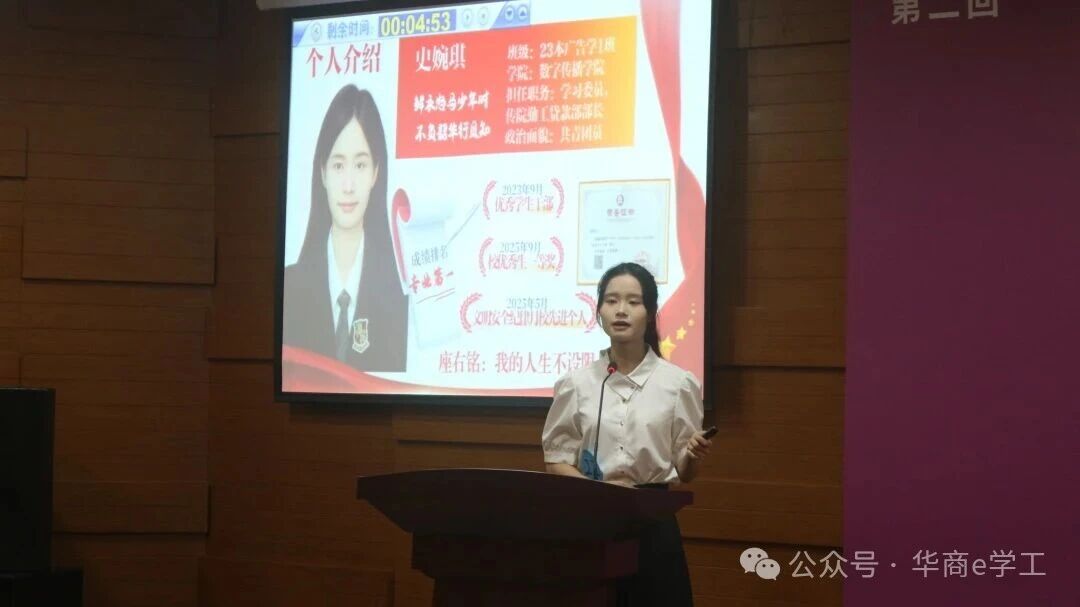 随后,竞选环节拉开帷幕。候选人依次登台,借助精心准备的演示材料,在演讲与答辩中,生动展现了他们在学业科研、社会实践、志愿服务等领域的优异成绩与全面发展的个人风采。他们或慷慨激昂,或沉着冷静,用真挚的语言讲述了在校期间的成长与收获。在面对评委们的提问时,候选人们思维敏捷、对答如流,充分展现了华商学子过硬的专业能力、清晰的逻辑思维和良好的精神风貌。