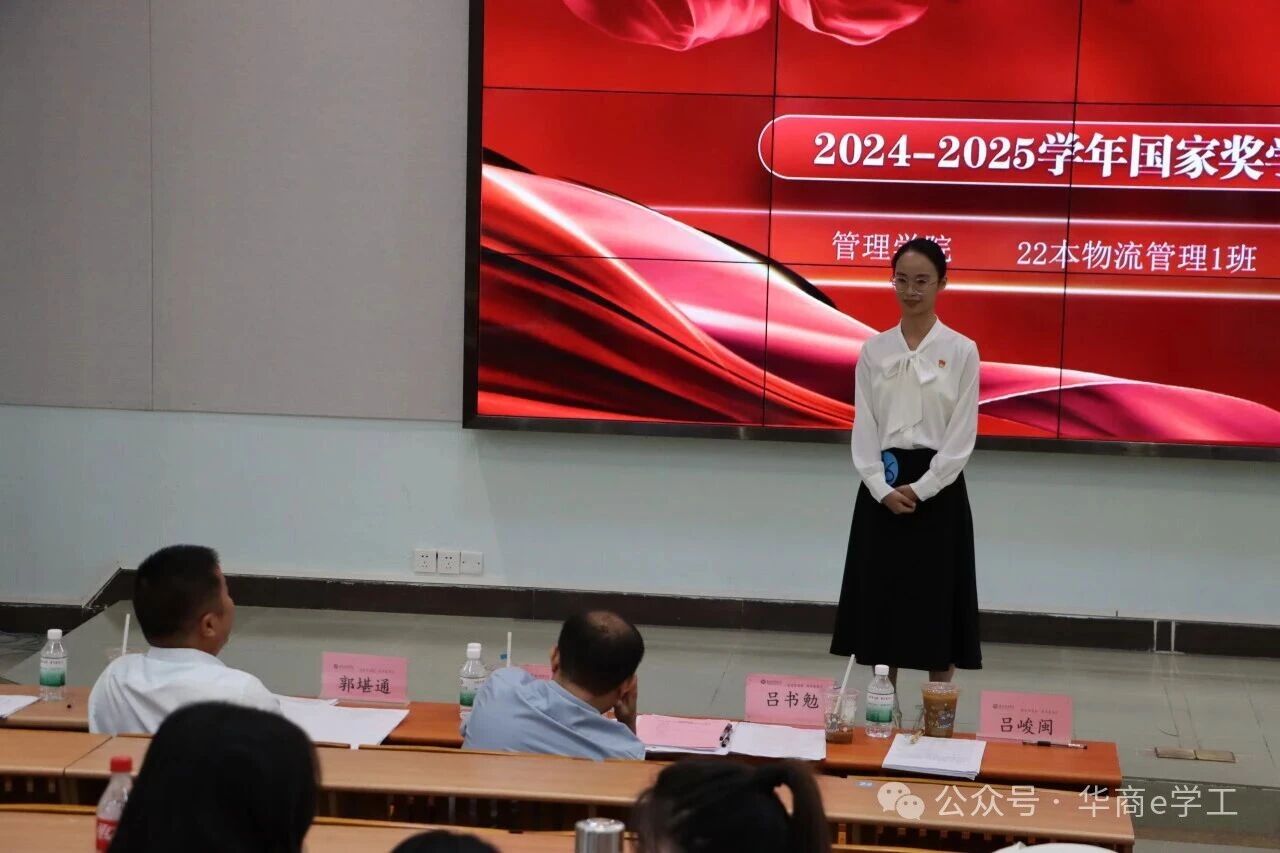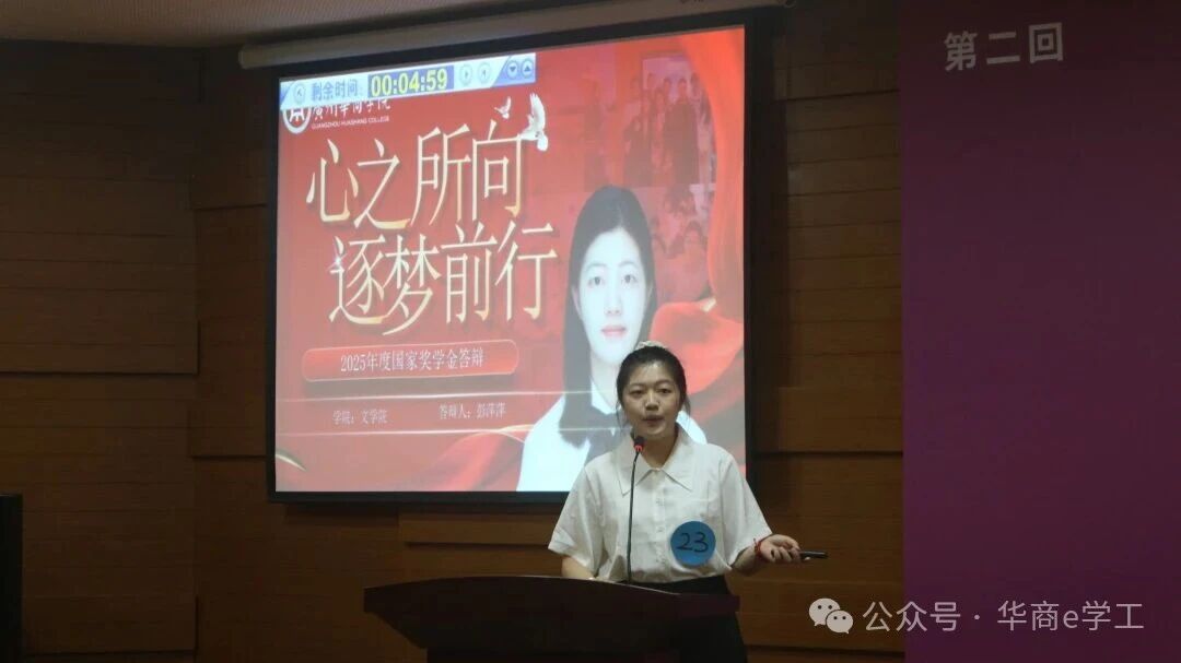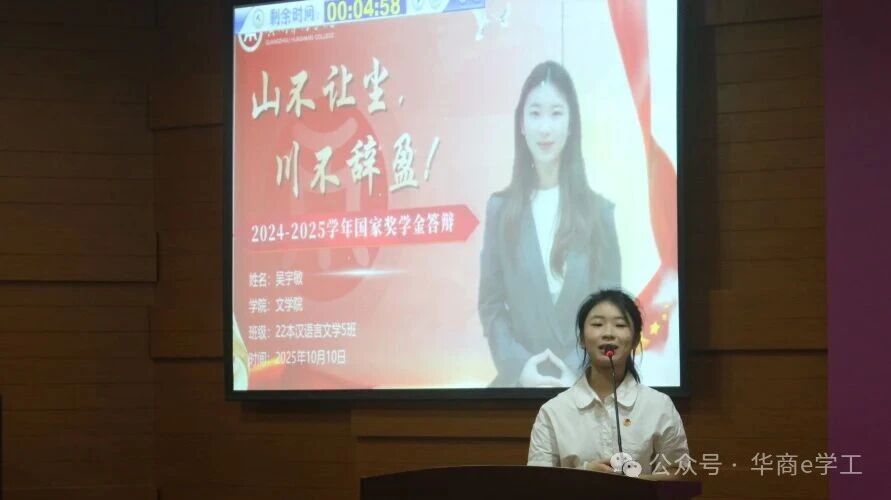 2025年10月10日下午,广州华商学院隆重举行2024-2025学年国家奖学金评审答辩会。本次答辩设图书馆报告厅与励志楼C407两个分会场,52名经层层选拔脱颖而出的优秀学子分为两组,通过精彩的演讲与答辩展开最终角逐。