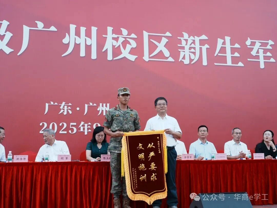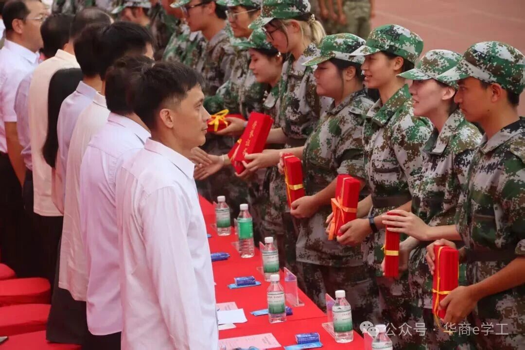 难忘军训时光,更念教官恩情。校领导向承训部队赠送锦旗,表达全校师生的诚挚谢意。随后,军训团团旗被郑重接回,象征着军训任务的圆满完成,也标志着新征程的正式开始。