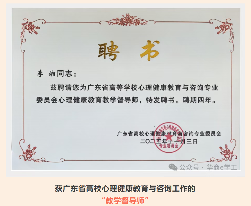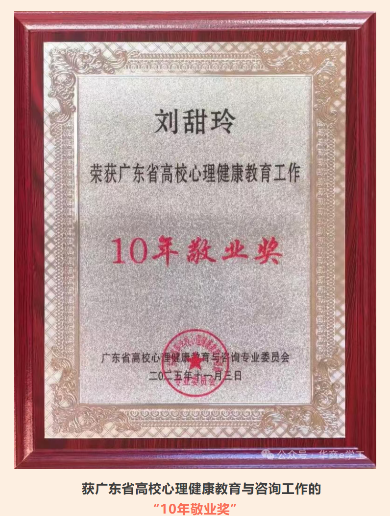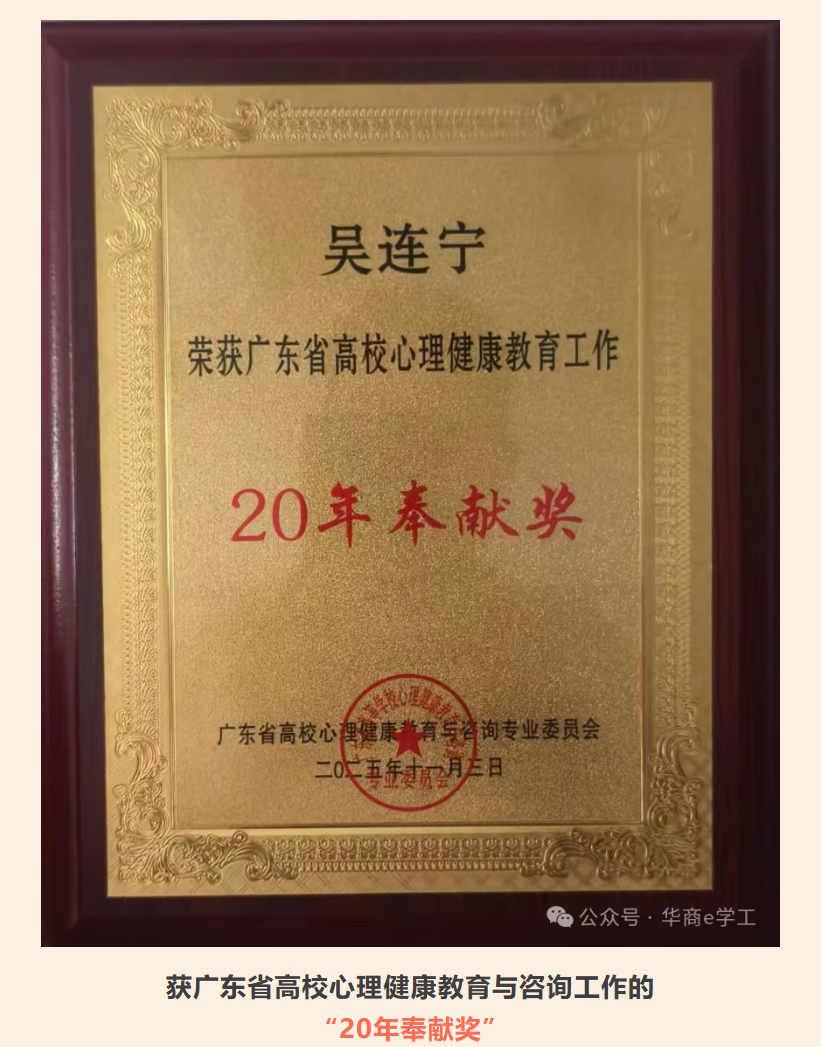 会议表彰了2024-2025年度在高校学生心理健康教育与咨询工作中做出突出贡献的先进集体和先进个人。经组委会专家的严格评选,我校斩获25项荣誉,这是对我校心理健康教育工作的高度认可与肯定。其中,广州华商学院心康中心获评广东省高校心理健康教育与咨询工作“先进集体”称号;李湘主任、吴连宁老师荣获“教学督导师”称号;吴连宁老师、胡小娟老师、刘甜玲老师分别获的“20年奉献奖”、“10年敬业奖”; 陈少鸿老师、杨李军老师获评“先进个人”称号;李娇娇老师、陈梅老师、张超老师、吴连宁老师等获得优秀论文二等奖、三等奖共17项。