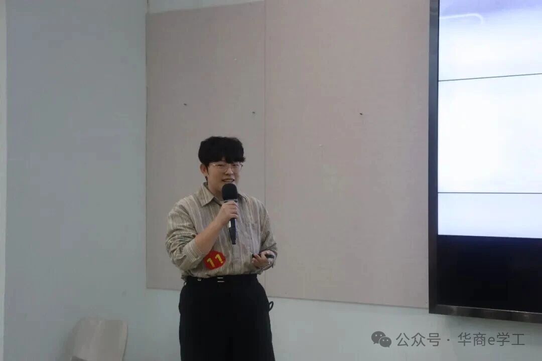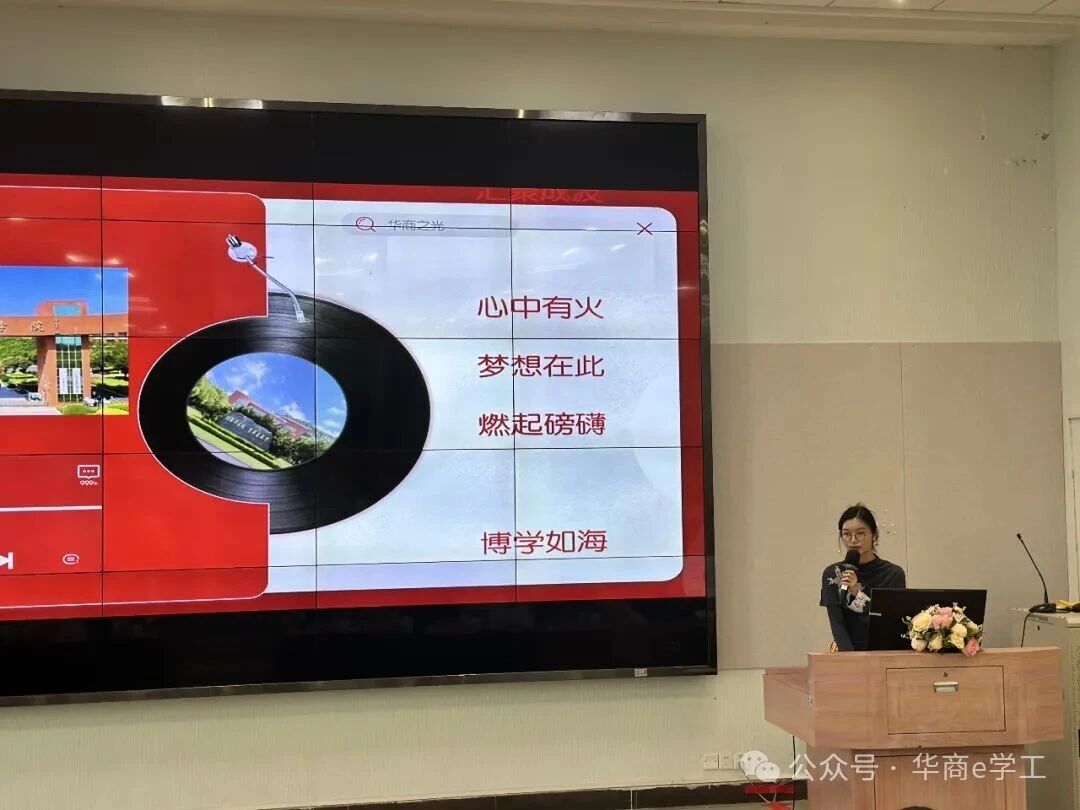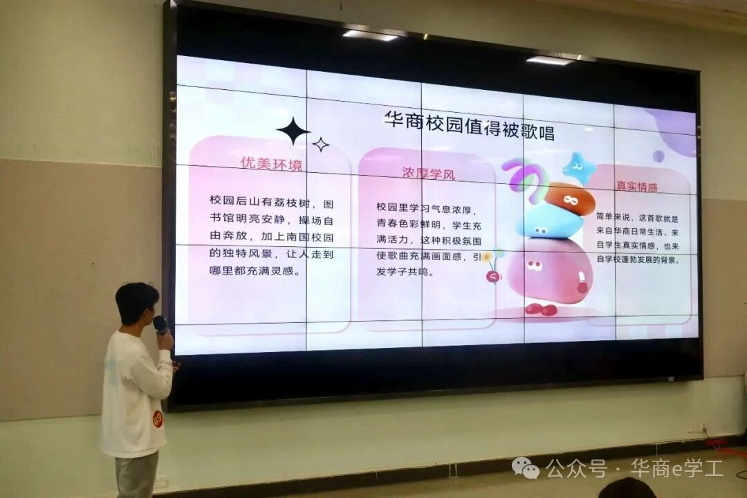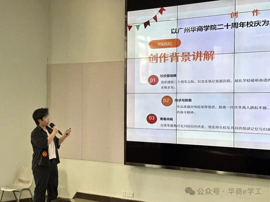 随后,大赛进入精彩的作品展示环节。12组参赛作品风格多元、内涵丰富,紧扣校庆主题与文化内核,充分展现了华商学院师生的创作才华与对母校的深厚情感。《廿载弦歌》以古典伴奏搭配轻快旋律,尽显校园文化底蕴;《廿载华光》凭借雅致古风歌词,诠释传统文化之美;《星芒向朝阳》旋律明快,传递积极向上的创作理念;两组《华商之光》各具特色,一组以快节奏引发情感共鸣,另一组用四字歌词搭配灵动旋律,韵味十足。此外,《风吹过华商的日子》轻快灵动,《行于华商》取材校园黄花风铃木,以舒缓旋律寄托校庆深情;《华商逐梦新程》抒情励志,歌词意象丰富,凸显华商核心价值;《华商,青春起航的地方》聚焦优良学风,传递青春正能量;《华商之章》以摇滚混搭轻快旋律,彰显学校独特风采;《苏东坡,把我唱给你听》从历史典故中汲取灵感,古风慢旋律尽显文化韵味;《爱聚华商》歌词贴合校园生活,兼具思想内涵与传唱度。每一位参赛者都详细介绍了作品的创作背景、缘由、历程及创新之处,并现场展播MV,赢得阵阵掌声。