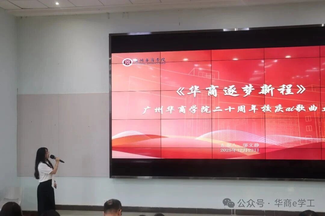 为献礼学校二十周年校庆,深化校园文化建设,2025年12月23日,文学院在广州校区励志楼C407课室成功举办以“歌词颂华章·AI赋商韵”为主题的AI歌曲创作大赛决赛。本次大赛创新融合校园文化、增城人文底蕴与AI技术,为师生搭建起跨界创作的专业展示平台,用科技赋能艺术,为校庆增添了独特的文化韵味。