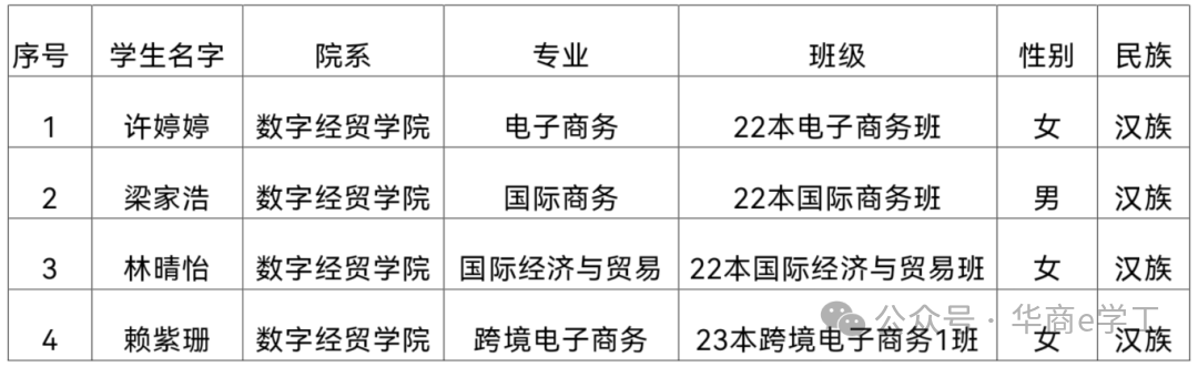 根据《关于做好2025年广州华商学院国家奖助学金工作的通知》相关文件精神,我院秉承公开公平公正的原则,严格按照国家奖学金评审程序,经过个人申请、资格审核、学院评审委员会讨论,经研究拟推荐以下4名学生为国家奖学金候选人。具体名单信息如下: